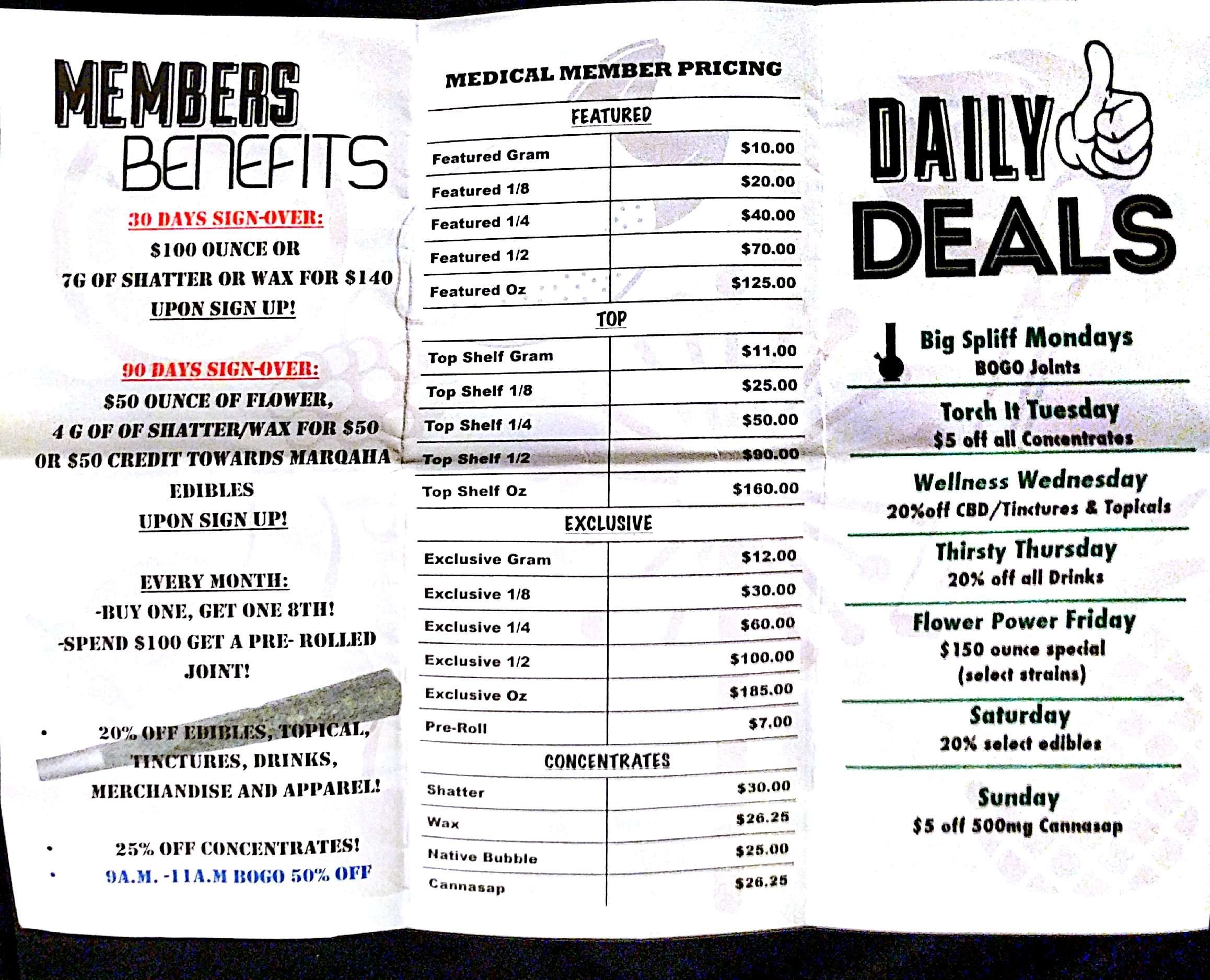 Native Roots Member Benefits MenuThe medical daily deals extend to anyone with a medical card. For those who choose Native Roots to be their caregiver are allowed access to lower pricing on edibles, tinctures, topicals, and drinks in addition to monthly BOGO 1/8ths. Dispensary deals in Colorado vary, yet BOGO joint Monday is one of the most cost effective way to get some ground flower. As a medical member, you get access to 20% off edibles and such at any location, yet you can only redeem the daily deals at the location your plants are signed up at.