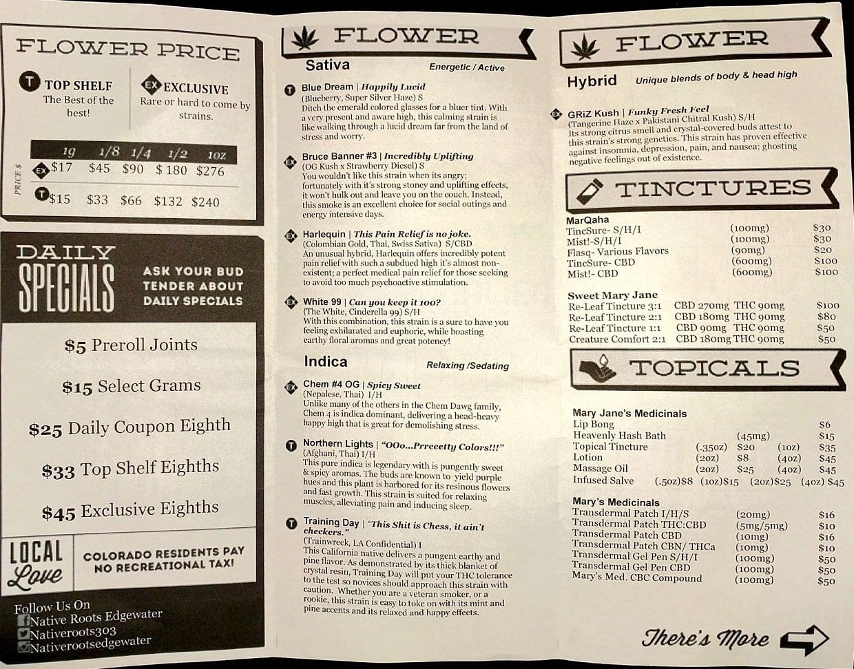 Native Roots Rec MenuBoasting an organized layout, describing the taste, aroma, and effects of strains currently available as well as the cost and categories of everything from edibles to grinders, the menu compliments the experience. I am all about those $5 dollar prerolls.